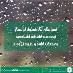 وكانت أمانة العاصمة المقدسة قد أصدرت عدد من التنبيهات والتعليمات التوعوية ، والتي يمكن اتباعها عند هطول الأمطار ؛ حفاظًا على سلامة السكان والزوار من المخاطر والتأكيد على ضرورة التقيد والالتزام