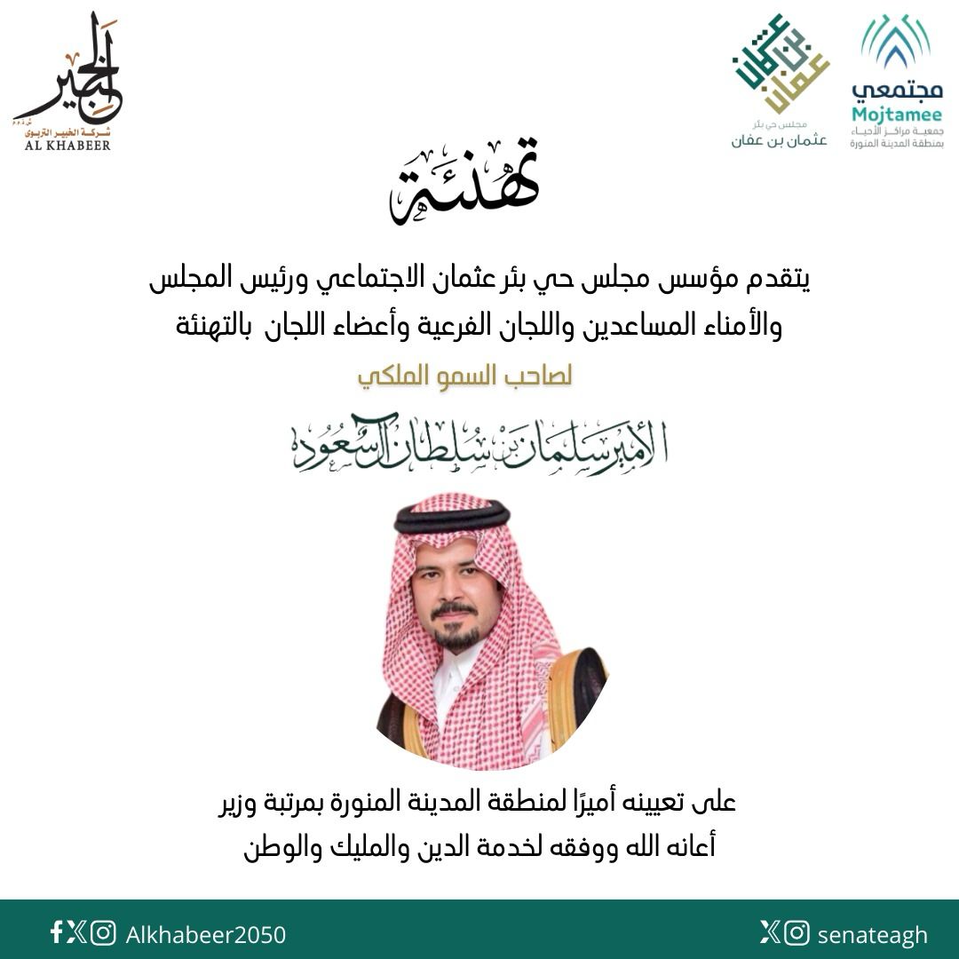 قدم مؤسس مجلس حي بئر عثمان الاجتماعي و رئيس المجلس و الأمناء المساعدين و اللجان الفرعية و أعضاء اللجان بالتهنئة لصاحب السمو الملكي الأمير سلمان بن سلطان آل سعود على تعينه أميرا لمنطقة المدينة المنورة بمرتبه وزير ، داعيين الله أن يعينه الله ويوفقه لخدمة الدين و المَلِكْ و الوطن