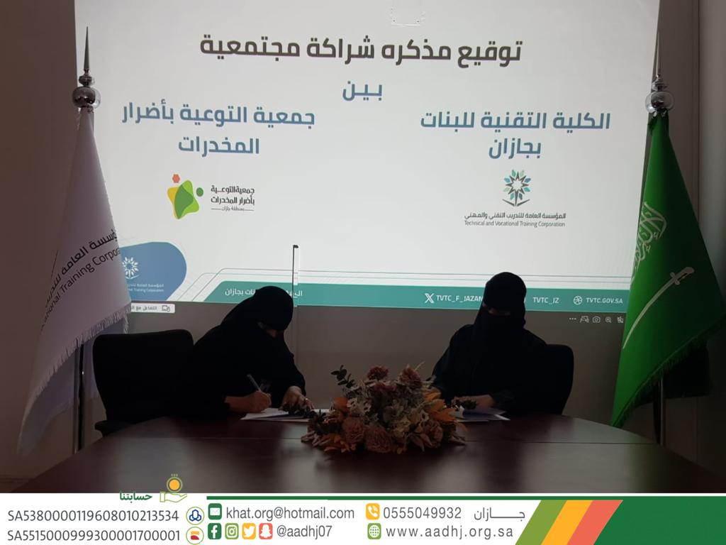 وقعت جمعية التوعية بأضرار المخدرات بمنطقة جازان اتفاقية تعاون مع الكلية التقنية للبنات بمحافظة أبو عريش وقعت الاتفاقية من طرف الجمعية عضو مجلس إدارة الجمعية رئيس اللجنة الاعلامية أ/ حليم الفرجي ومن طرف الكلية أ/ خنساء حكمي عميدة الكلية .