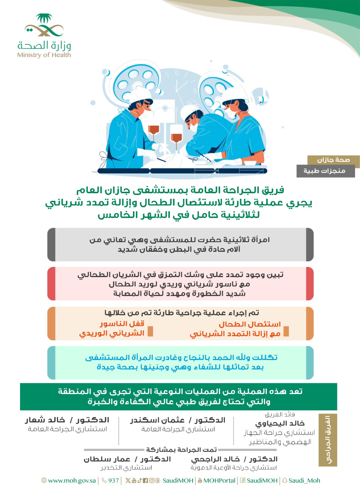 أجرى فريق الجراحة العامة بمستشفى جازان العام عملية طارئة لاستئصال الطحال وإزالة تمدد شرياني لامرأة ثلاثينية حامل في الشهر الخامس.