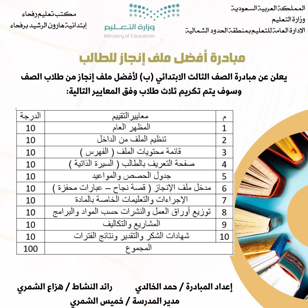 مبادرة لأفضل ملف إنجاز بمدرسة هارون الرشيدالإبتدائية بمحافظة رفحاء