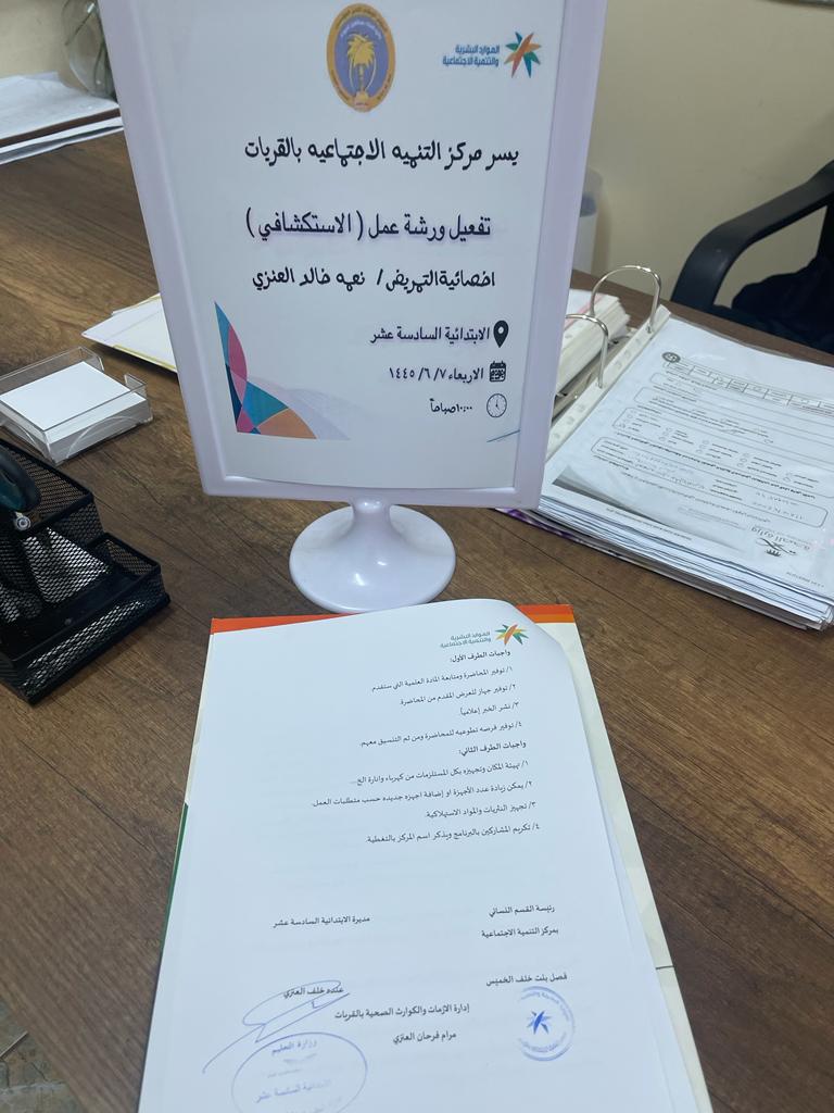 ضمن برامج وأنشطة المجتمع المحلي ، فعل مركز التنمية الاجتماعية بالشراكة مع الابتدائية السادسة عشر برنامج ( استكشافي ) فعلته الممرضة / نعمة خالد العنزي من مستشفى القريات العام ، تطرقت فيه عن استكشاف التاريخ المرضي من خلال توزيع استمارات على الطالبات وتعبئة الخانات المرضية بنعم أولا ، بالاضافه إلى أخد الطول والوزن ، وقياس الضغط والسكر للطالبات.