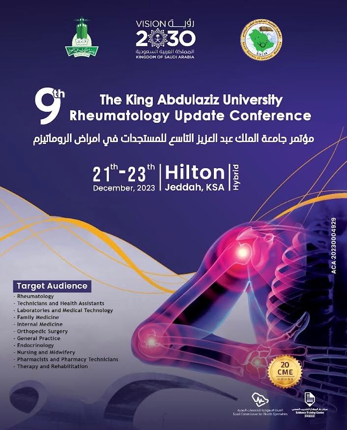 تعقد جامعة الملك عبد العزيز المؤتمر السنوي التاسع المستجدات في أمراض الروماتيزم، وينظمه الجمعية العلمية السعودية للطب الباطني. الذي يعقد في فندق هيلتون بجدة على مدى ثلاثة أيام من الخميس إلى السبت في الفترة 8 -10 الجماد الثاني 1445 هـ الموافق 21-23 ديسمبر 2023م .