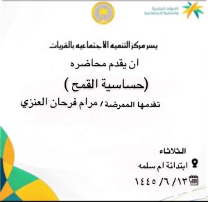 أقام مركز التنمية الاجتماعية بالقريات بالشراكة مع ابتدائية أم سلمة وإدارة الكوارث والأزمات بالقريات دورة توعوية بعنوان : (حساسية القمح) ، قدمتها الممرضة / مرام فرحان العنزي .