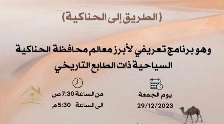 في حوالي الساعه 9 صباحا, زياره قلعه الحناكيه التاريخيه والتجول داخل القلعه، ثم تم تقديم عرض حربي تبعه العاب شعبيه. في حوالي الساعه 10:30 استكمل الفريق البرنامج الجميل، بزيارة جبل العهين التاريخي مع جوله في مواقع النقوش والرسومات وتاريخها. ثم زياره نفوذ أبرق العزاف “موسيقى الصحراء” وتناول وجبه الغداء في مخيم ومنتجع الطريقي وسط النفوذ ، ثم حضور فعاليات “شاعره البرده” كعب بن زهير ثم جوله في مخيم الطريقي وعرض الصيد بالصقور، التزلج على الرمل، التطعيس على النفوذ ثم عرض الطيران الشراعي، النحت على الرمل، اختتمت فعاليات الرحلة بركوب ” سفن الصحراء” “الهجن” .