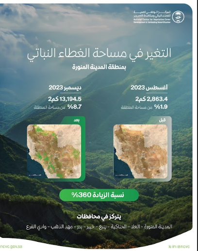 كشف المركز الوطني لتنمية الغطاء النباتي ومكافحة التصحر، عن زيادة مساحات الغطاء النباتي في منطقة المدينة المنورة بنسبة بلغت 360% خلال الخمسة أشهر الأخيرة الماضية من عام 2023، بدايةً من أغسطس وحتى ديسمبر، بسبب هطول الأمطار في هذه الفترة.