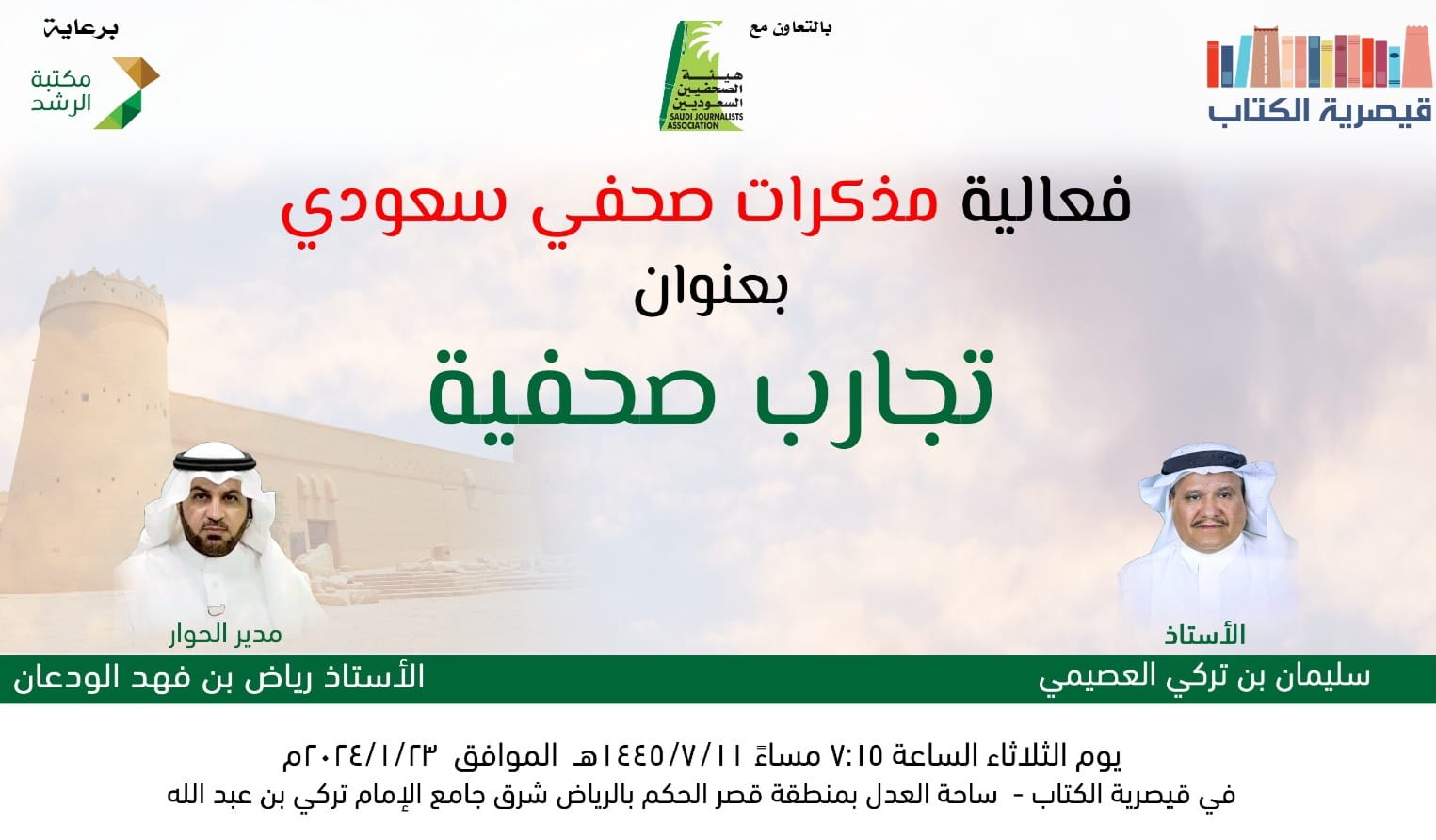 برعاية مكتبة الرشد وبالتعاون مع هيئة الصحفيين السعوديين ، تستضيف قيصرية الكتاب فعالية ” مذكرات صحفي سعودي” بعنوان “تجارب صحفية” .