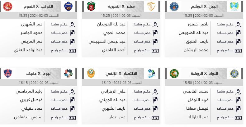 يقود تحكيم مواجهة الجيل والوشم اليوم السبت طاقم تحكيم مكون من: حكم ساحة ناصر خنفور وحكم مساعد عبدالله الضويعن وحكم مساعد نايف العتيق وحكم رابع محمد الريشان ويقود تحكيم مواجهة مضر والنعيرية طاقم تحكيم مكون من حكم ساحة عبدالله العويدان وحكم مساعد محمد الحجي وحكم مساعد عبدالرحمن السهيمي وحكم رابع