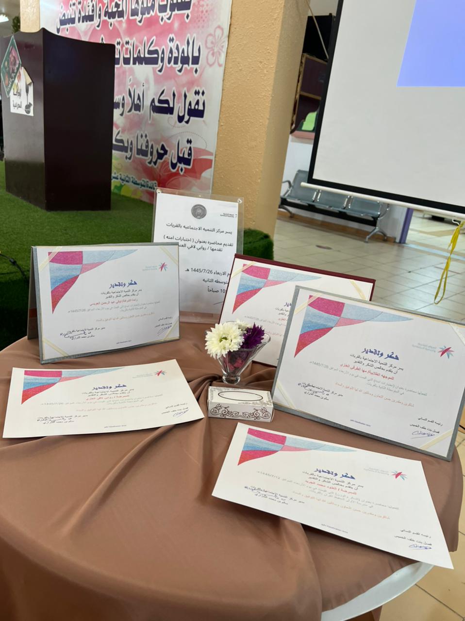 أقام مركز التنمية الاجتماعية محاضرة لمدة يومين بعنوان/اختبارات آمنة، بالشراكة مع المدرسة الابتدائية للتحفيظ بالناصفة والمتوسطة الثانية عشر بالقريات..