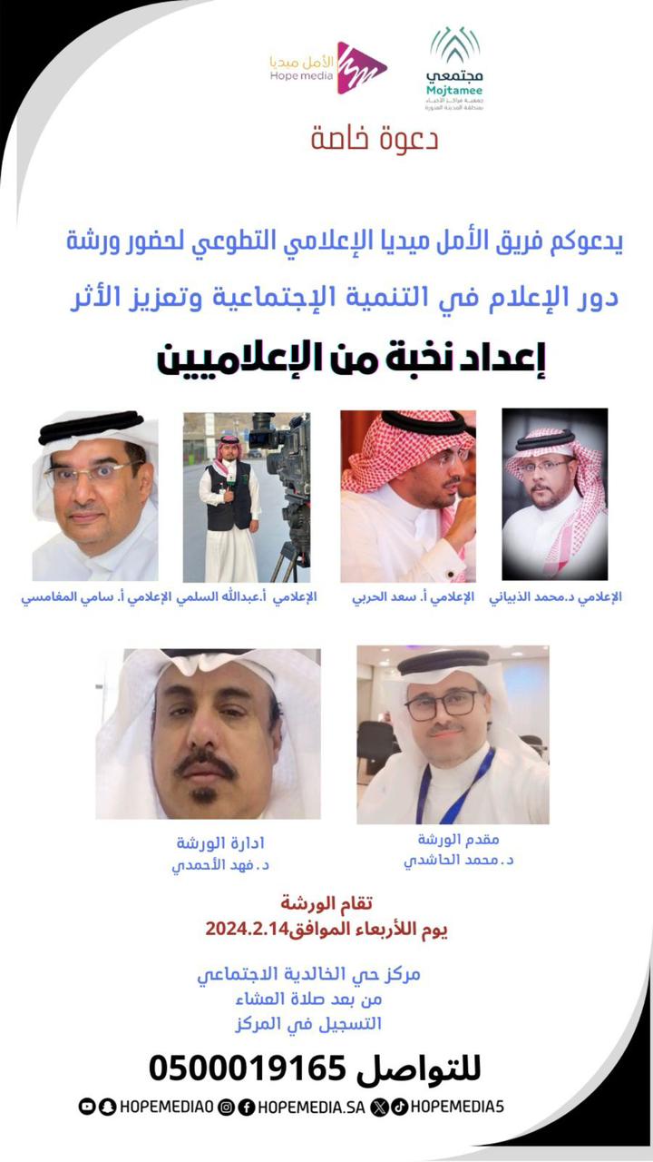 ينظم فريق الأمل ميديا الإعلامي التطوعي بالمدينة المنورة ، ورشة عمل بعنوان “دور الإعلام في التنمية الاجتماعية وتعزيز الأثر”، يشارك فيها نخبة من الإعلاميين ، ويقدمها د. محمد الحاشدي ، ويقدمها د. فهد عبد العزيز الأحمدي ، وذلك يوم الأربعاء الموافق ١٤ -٢-٢٠٢٤م في مركز الخالدية الإجتماعي بعد صلاة العشاء.