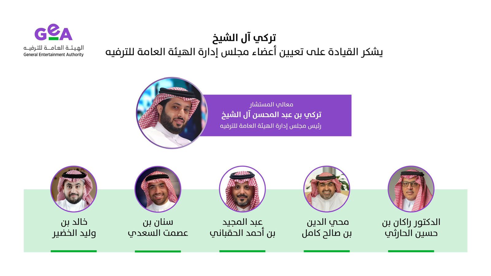 رفع معالي المستشار تركي بن عبد المحسن آل الشيخ رئيس مجلس إدارة الهيئة العامة للترفيه (GEA) ، أسمى عبارات الشكر والتقدير إلى خادم الحرمين الشريفين الملك سلمان بن عبد العزيز آل سعود، وإلى سمو ولي عهده الأمين صاحب السمو الملكي الأمير محمد بن سلمان بن عبد العزيز رئيس مجلس الوزراء حفظهم الله – على الثقة الكريمة بتعيين أعضاء مجلس إدارة الهيئة من المهتمين والمتخصصين في المجالات ذات العلاقة بعمل الهيئة، وهم الدكتور راكان بن حسين الحارثي، محي الدين بن صالح كامل عبد المجيد بن أحمد الحقباني، خالد بن وليد الخضير ، سنان بن عصمت السعدي.