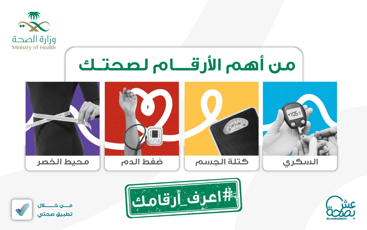 أطلقت الصحة حملة اعرف أرقامك وهي مبادرة وطنية صحية موجهة لكافة أفراد المجتمع وتهدف إلى التوعية بأهمية معرفة ومتابعة أبرز 4 مؤشرات حيوية تؤثر على صحة الفرد والتي تشمل ” معدل الضغط• قياس السكري• قياس محيط الخصر • رقم كتلة الجسم ” ويُمكن للمستفيد إدخال ومتابعة أرقامه الصحية عبر تطبيق صحتي بكل يسر و سهولة، حيث يساعده التطبيق على المتابعة والإرشاد الصحي.