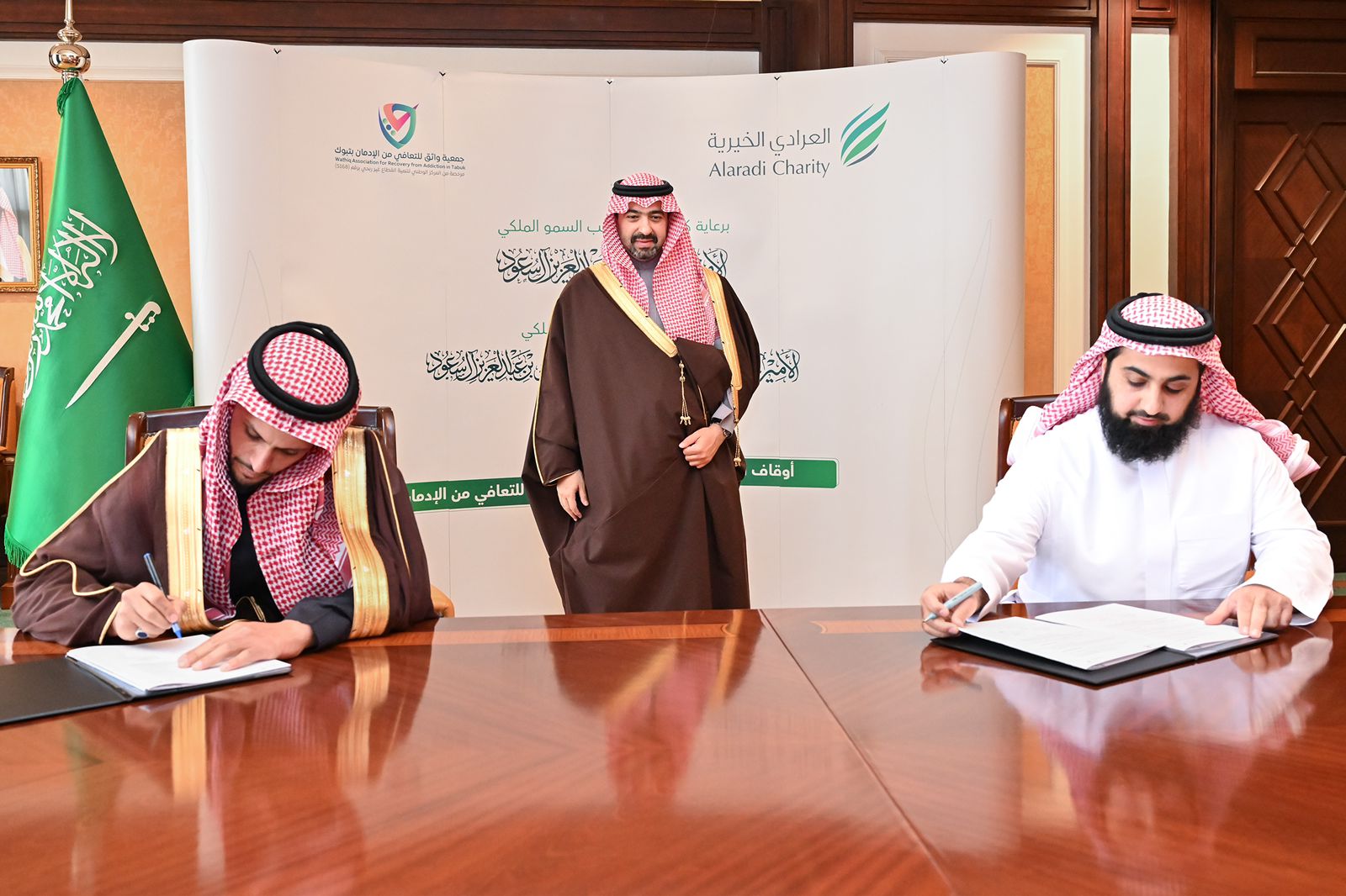 تحت رعاية صاحب السمو الملكي الأمير فهد بن سلطان بن عبدالعزيز أمير منطقة تبوك ،شهد صاحب السمو الملكي الأمير خالد بن سعود بن عبدالله الفيصل بن عبدالعزيز نائب أمير منطقة تبوك، بالإمارة اليوم, توقيع اتفاقية شراكة مجتمعية بين جمعية واثق للتعافي من الإدمان، وأوقاف العرادي الخيرية، بحضور رئيس مجلس إدارة جمعية واثق للتعافي من الإدمان بالمنطقة بدر بن محمد العطوي و المدير التنفيذي لأوقاف العرادي الخيرية إبراهيم بن عبدالله صالح العبدالكريم .