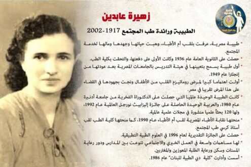 زهيرة عابدين أم الأطباء -كما يعرفها المجتمع المصري- تعتبر من أهم نساء المجتمع الإسلامي عامة والمصري خاصة, فقد وهبت حياتها وجهدها ومالها لخدمة المجتمع وقدمت مثلاً رائعاً للمرأة المسلمة خلال القرن الماضي.
