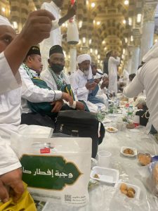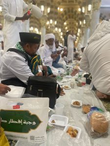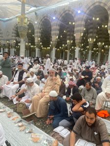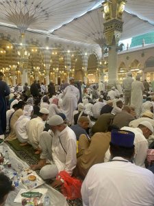 حيث قبل الإفطار يتم تجهيز الوجبات للسفر والحشود تنتظر الآذان وأبناء طيبة يقومون بخدمة ضيوف المسجد الشريف، إنسانية عظيمة وماهي إلا لحظات حتى يرفع الآذان ويبدأ الإفطار ثم خلال خمس دقائق جميع السفر ترفع بدقة ونظافة ومعاونة حقاً بلد عظيم يقوم بخدمة زواره …