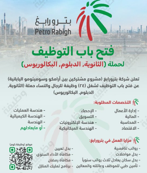 تعلن شركة بترورابغ (مشروع مشتركين بين أرامكو وسوميتومو اليابانية) عن فتح باب التوظيف لشغل (24) وظيفة للرجال والنساء حملة (الثانوية, الدبلوم, البكالوريوس) على المسميات التالية:
