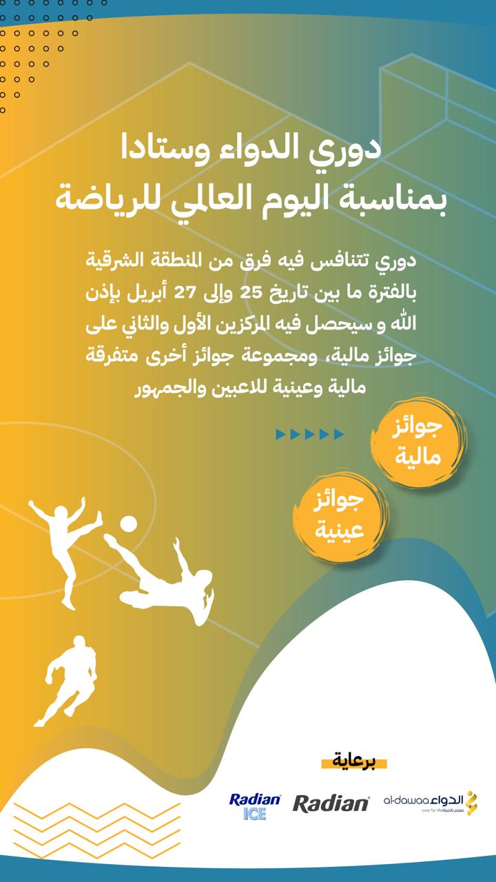 أعلنت شركة ستادا للأدوية “الشركة العالمية المتخصصة في إنتاج وتسويق مستحضرات الرعاية بصحة المستهلك” بالشراكة مع صيدليات الدواء استعدادهم لإطلاق دوري الأحياء الأول في المنطقة الشرقية وذلك تزامنا مع اليوم العالمي للرياضة الموافق السادس من ابريل لكل عام والذي يحتفل فيه العالم بشكل عام والمملكة بشكل خاص بالعديد من الأنشطة والفعاليات التي تذكر بأهمية ممارسة النشاط البدني والأنواع المختلفة من الرياضة ولجميع الفئات العمرية للمحافظة على الصحة العامة واللياقة البدنية ومحاربة العديد من الأمراض المزمنة والخطيرة الناجمة عن قلة ممارسة الرياضة واتباع نمط الحياة الصحي.
