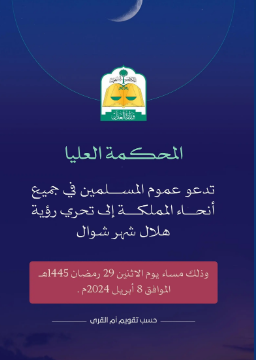 فنظراً لما تضمنه قرار المحكمة العليا رقم ( 180 / هـ ) وتاريخ 29 / 8 / 1445هـ أن يوم الاثنين 1 / 9 / 1445هـ ـ حسب تقويم أم القرى ــ الموافق 11 / 3 / 2024م، هو غرة شهر رمضان المبارك لعام 1445هـ؛ فإن المحكمة العليا ترغب إلى عموم المسلمين في جميع أنحاء المملكة تحري رؤية هلال شهر شوال مساء يوم الاثنين 29 / 9 / 1445هـ ــ حسب تقويم أم القرى ــ الموافق 8 / 4 / 2024م.