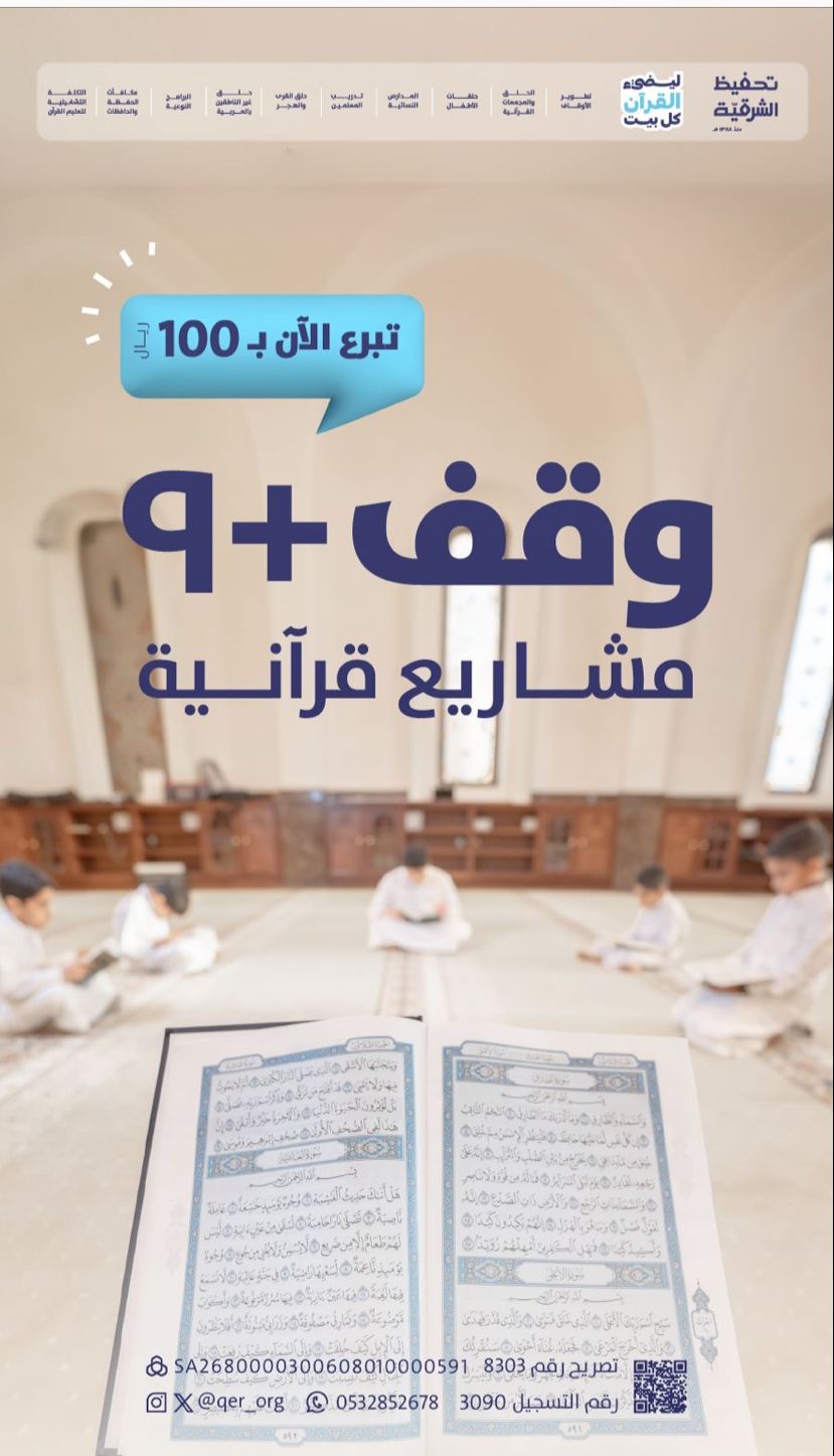 أطلقت جمعية تحفيظ الشرقية مرحلتها الأخيرة في العشر الأواخر من حملة ” ليضيء القرآن كل بيت ” بوقف وتسعة مشاريع قرآنية، ومازال الدعم مستمرًا في مشروع وقف وتسعة مشاريع قرآنية، وذلك بعد اكتمال أسهم ليلة 27 في مشروع تحفيظ الشرقية .
