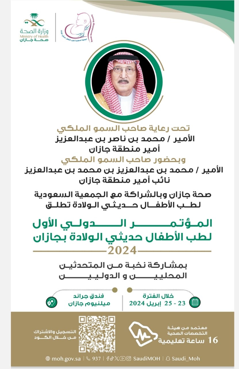 تحت رعاية صاحب السمو الملكي الأمير محمد بن ناصر بن عبدالعزيز، أمير منطقة جازان، وبحضور صاحب السمو الملكي الأمير محمد بن عبدالعزيز بن محمد، نائب أمير منطقة جازان، تطلق صحة جازان وبالشراكة مع الجمعية السعودية لطب حديثي الولادة. “المؤتمر الدولي الأول لطب الأطفال حديثي الولادة 2024 م ” وذلك في 23 وحتى 25 إبريل بفندق قراند ميلينيوم بجازان .