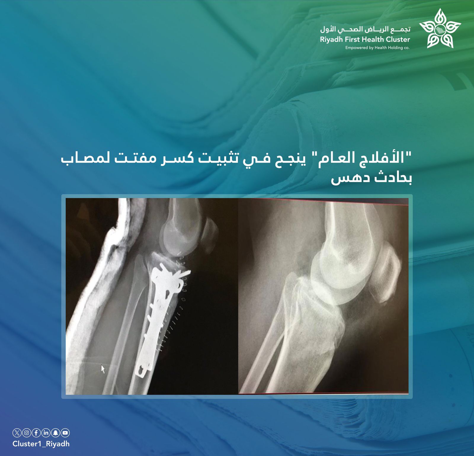 تمكن مستشفى الأفلاج العام عضو تجمع الرياض الصحي الأول من تثبيت كسر مفتت من الدرجة الخامسة في أعلى قصبة الساق اليسرى؛ لمصاب في العقد الرابع من عمره تعرض لحادث دهس.
