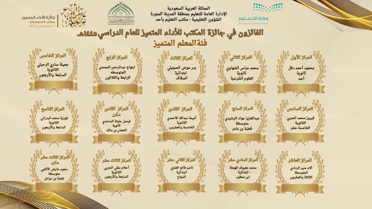 نبارك للزميل أ.بدر عوض الحجيلي الإعلامي في مجموعة صحف الغد ؛ حصوله على جائزه المكتب للأداء المتميز في دورتها الثانيه للعام الدراسي 1445 هـ فئة المعلم المتميز.