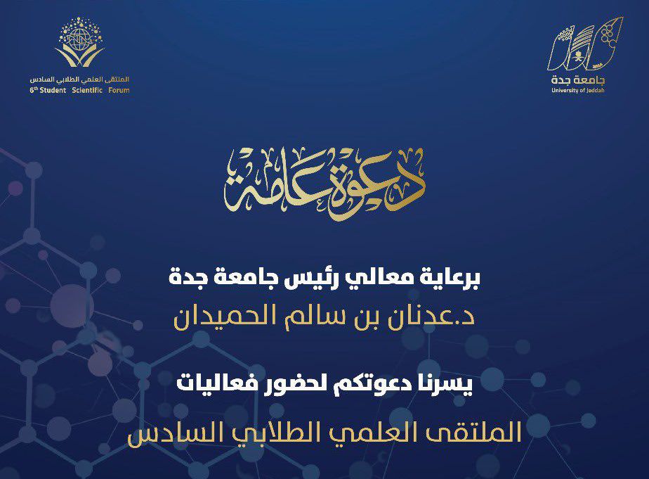 برعاية معالي رئيس جامعة جدة الدكتور عدنان الحميدان تبدأ يوم الأحد الموافق ٥ مايو فعاليات الملتقى العلمي الطلابيّ السادس ويستمر لمدة ثلاث أيام بمركز جامعة جدة للمؤتمرات.