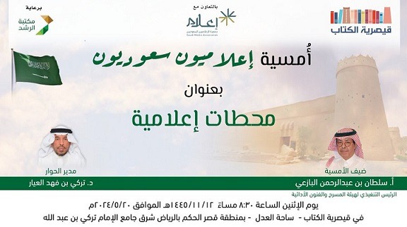 برعاية مكتبة الرشد وبالتعاون مع جمعية الإعلاميين السعوديين، تستضيف قيصرية الكتاب أمسية إعلاميون سعوديون بعنوان “محطات إعلامية” في الساعة ٨:٣٠ مساء يوم الإثنين 12/ 11/ 1445الموافق 20 مايو الحالي 2024 تستضيف فيها الأستاذ سلطان بن عبد الرحمن البازعي الرئيس التنفيذي لهيئة المسرح والفنون الأدائية، ويدير الحوار الدكتور تركي بن فهد العيار أستاذ الإعلام بجامعة الملك سعود والمستشار الإعلامي بقيصرية الكتاب