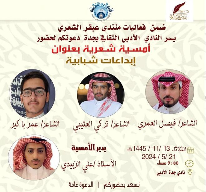 بقيم منتدى عبقر الشعري بالنادي الأدبي بجدة أمسيةشعرية ( إبداعات شبابية) يشارك فبها الشعراء فيصل العمري وتركي العتيبي وعمر باكير، ويديرها الأستاذ علي الزبيدي وذلك اليوم الثلاثاء ٢١/ ٥ / ٢٠٢٤م التاسعة مساء بقاعة مكتبة النادي َ
