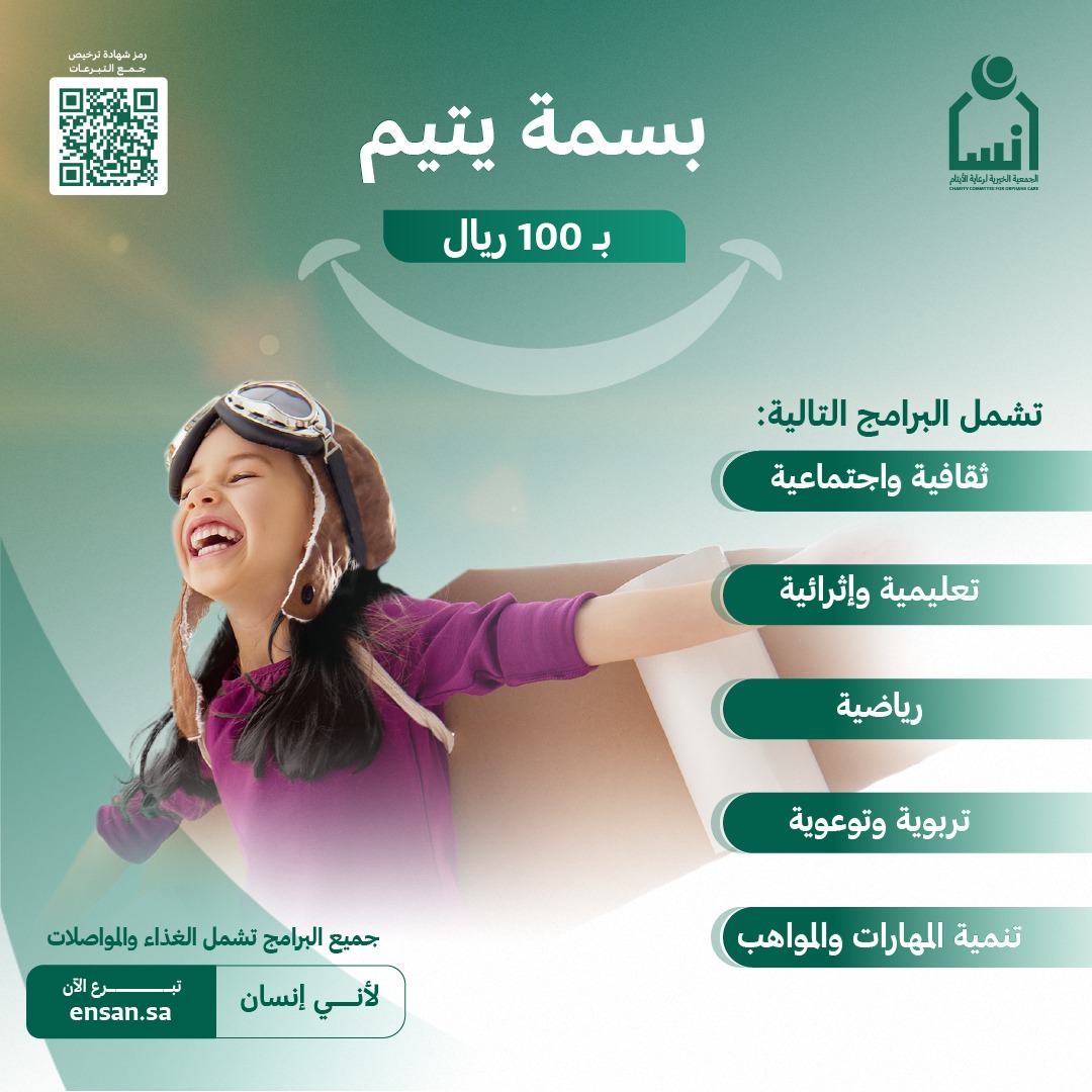 أطلقت الجمعية الخيرية لرعاية الأيتام بمنطقة الرياض “إنسان” مشروع “بسمة يتيم” والذي يُعنى بدعم البرامج والأنشطة من خلال تنمية المهارات العلمية والثقافية والاجتماعية للمستفيدين، وتتضمن أيضاً البرامج التربوية والتعليمية والتوعوية والرياضية والإثرائية، وتعزيز قدراتهم بمختلف المناشط والمواهب.