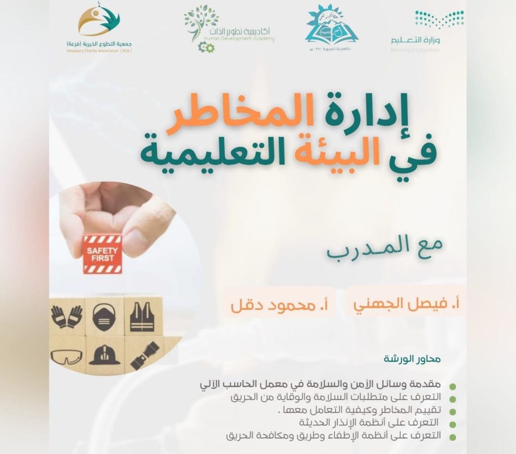 اختتمت ثانوية أحد التابعة لمكتب التعليم بأحد بالمدينة المنورة صباح يوم الخميس 15 ذو القعدة 1445هـ الموافق 23 مايو 2024م ، ورشة بعنوان ” إدارة المخاطر في البيئة التعليمية ” والتي نظمها نادي الحاسب الآلي بالمدرسة وبالشراكة المجتمعية مع الجهات ذات العلاقة .
