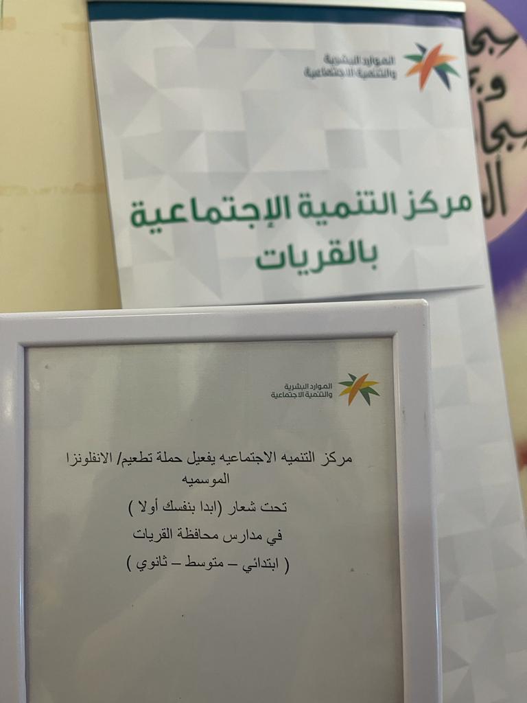 أقام مركز التنمية الاجتماعية  بالقريات حملة تطعيم ضد الإنفلونزا الموسمية تحت شعار (ابدا بنفسك أولا)بالشراكة مع مستوصف الحميدية ممثلا بالممرضة / وضحاء محمد العنزي والممرض بدر عوض الشراري ضمن برامج وأنشطة المركز الموجهة للمجتمع المحلي تضمنت الحملة منسوبي ومنسوبات كل من مركز التنمية الاجتماعية والحماية الأسرية والخدمات المساندة ن كما تضمنت طالبات مدارس محافظة القريات ( الثانوية الرابعة – المتوسطة الخامسة عشر – الابتدائية السادس عشر – الابتدائية التاسعة والعشرون – الثانوية التاسعة – الابتدائية العشرون – الثانوية السابعة )