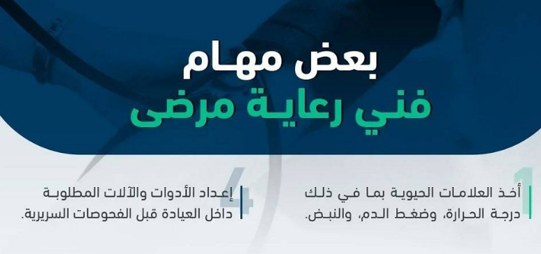 وأشارت الهيئة إلى أن خريج تخصص «فني رعاية المرضى» سيمارس عمله في التعامل مع المريض تحت إشراف أخصائي التمريض، وتشمل واجباته أخذ العلامات الحيوية، وإعداد الفراش، وتضميد الجروح، إضافة إلى مساعدة أخصائيي التمريض وتقديم الدعم والتوجيه لمرضى العيادات الخارجية أو المرضى المنومين.