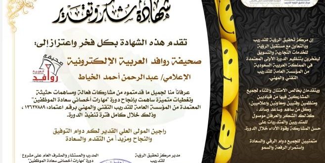 شكر وتقدير لـ “روافد العربية” من مراكز التدريب المعتمدة لدى المؤسسة العامة للتدريب المهني