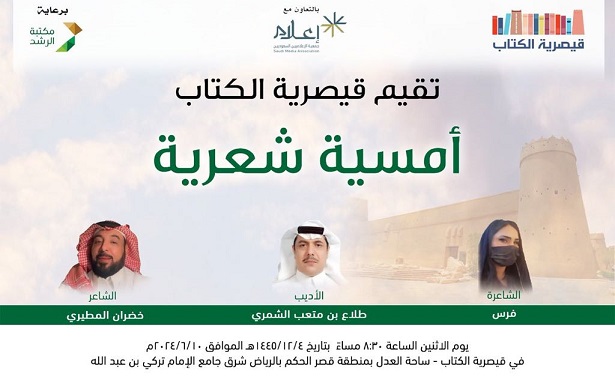 برعاية مكتبة الرشد وبالتعاون مع جمعية الإعلاميين السعوديين تستضيف قيصرية الكتاب فعالية ” أمسية شعرية” يوم الاثنين بتاريخ ١٤٤٥/١٢/٠٤ الموافق ٢٠٢٤/٠٦/١٠م الساعة ٠٨:٣٠ مساء