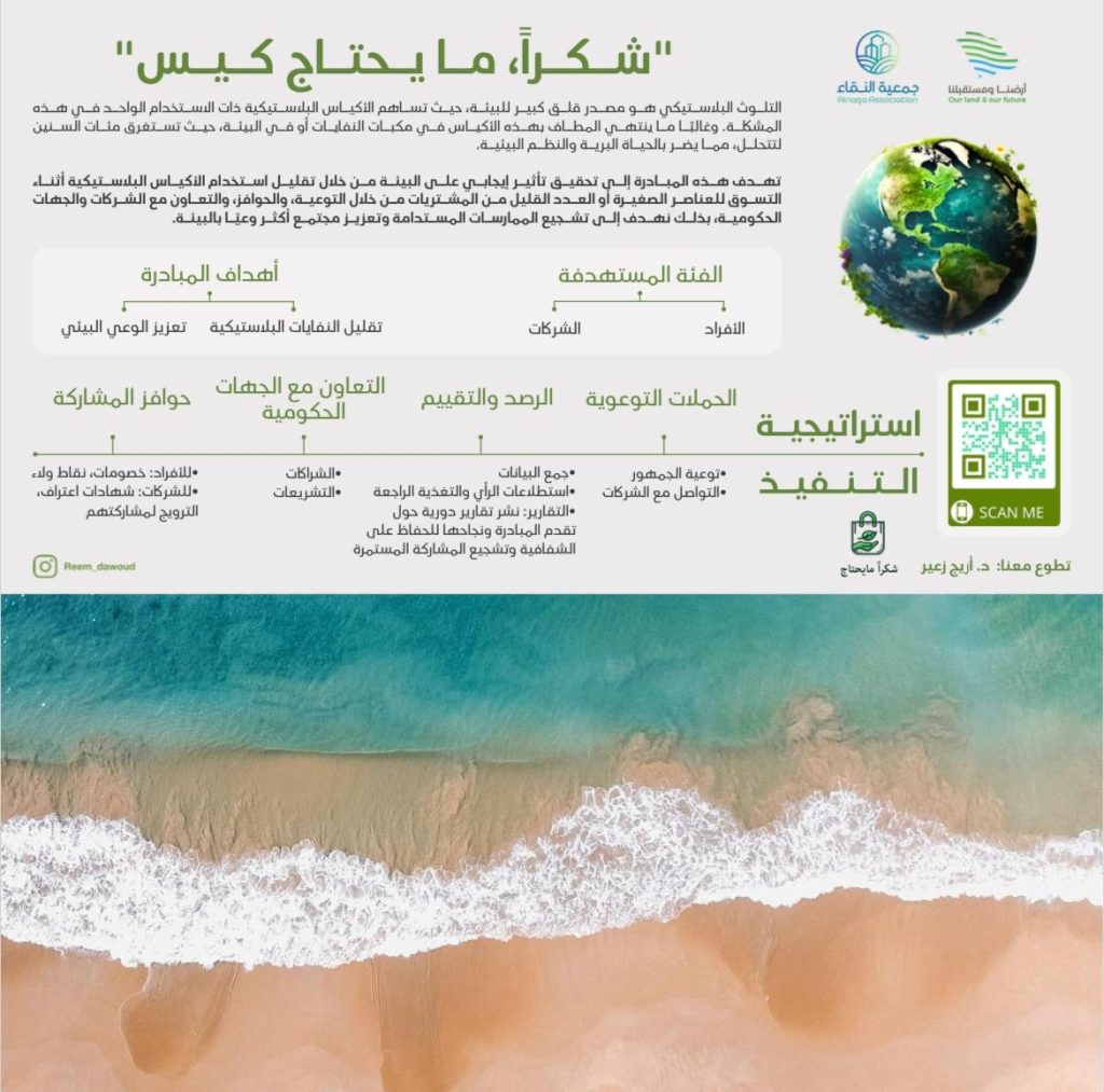 التلوث البلاستيكي يشكل خطراً كبيراً على البيئة، حيث تستغرق الأكياس البلاستيكية مئات السنين لتتحلل. لذلك تهدف مبادرة ( شكراً ، ما يحتاج كيس) والمقدمة من قبل د. أريج زعير عضو مؤسس في جمعية النقاء وعضو هيئة تدريس في جامعة طيبة إلى تقليل استخدام الأكياس البلاستيكية عن طريق تشجيع الأفراد والشركات على تجنب استخدامها أثناء التسوق للمشتريات الصغيرة. تسعى المبادرة لتعزيز البدائل المستدامة للأكياس البلاستيكية، وزيادة الوعي البيئي، وتقليل النفايات البلاستيكية.