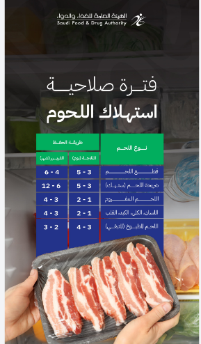 كشفت الهيئة العامة للغذاء والدواء عن فترة صلاحية استهلاك اللحوم ومدة حفظها في الثلاجة أو الفريزر، بالتزامن مع عيد الأضحى المبارك.