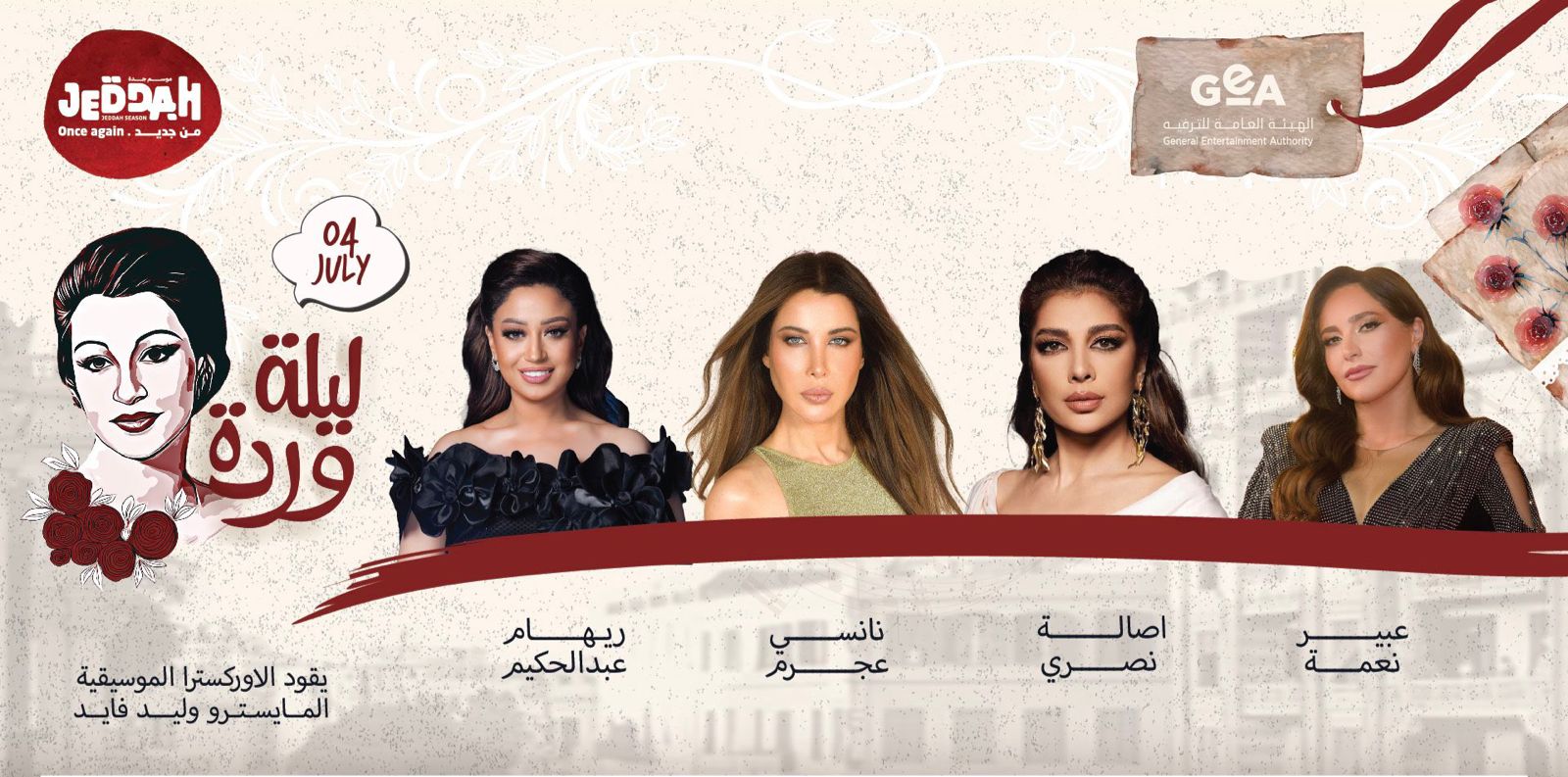 ضمن فعاليات موسم جدة 2024 تحت شعار ” من جديد ” تحتفل مدينة جدة بالفنانة الراحلة وردة الجزائرية في ليلة من ليالي الروائع برعاية الهيئة العامة للترفيه GEA و بتنظيم من “بنش مارك” في يوم 4 يوليو في قاعة مسرح عبادي الجوهر أرينا .