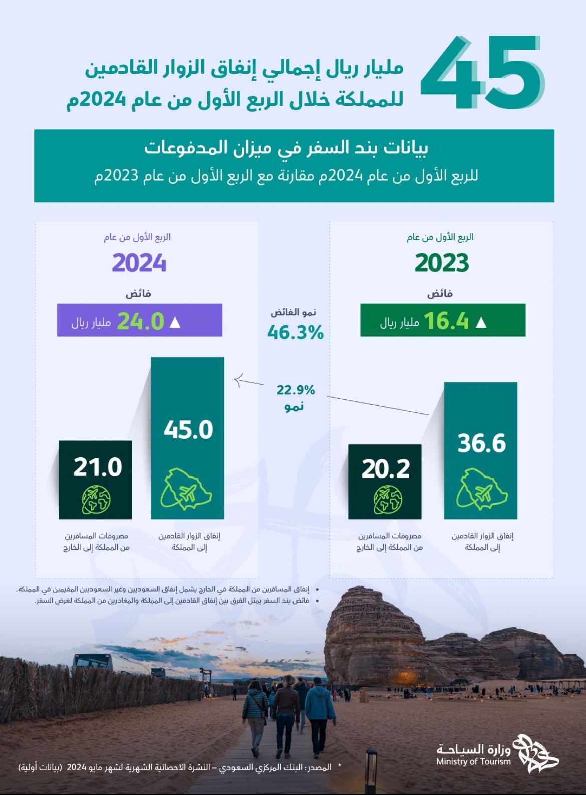 حققت المملكة العربية السعودية نتائج مميزة في إنفاق الزوّار الوافدين إلى المملكة خلال الربع الأول من عام 2024م، حسب بيانات بند السفر في ميزان المدفوعات. وقد بلغ حجم الإنفاق الإجمالي للزوّار أكثر من 45 مليار ريال سعودي، مسجّلاً بذلك نمواً بنسبة 46% مقارنةً بالفترة المماثلة من عام 2023م.