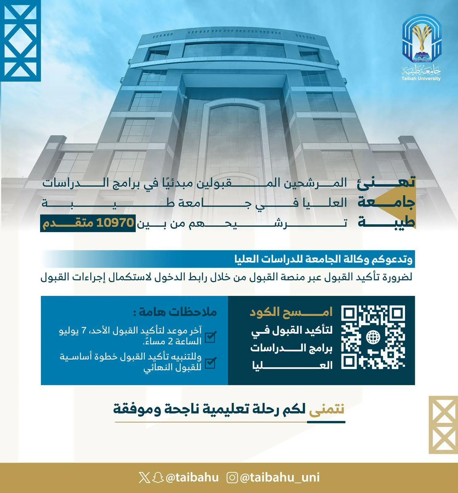 جامعة طيبة تعلن أسماء المقبولين في برامج الدراسات العليا