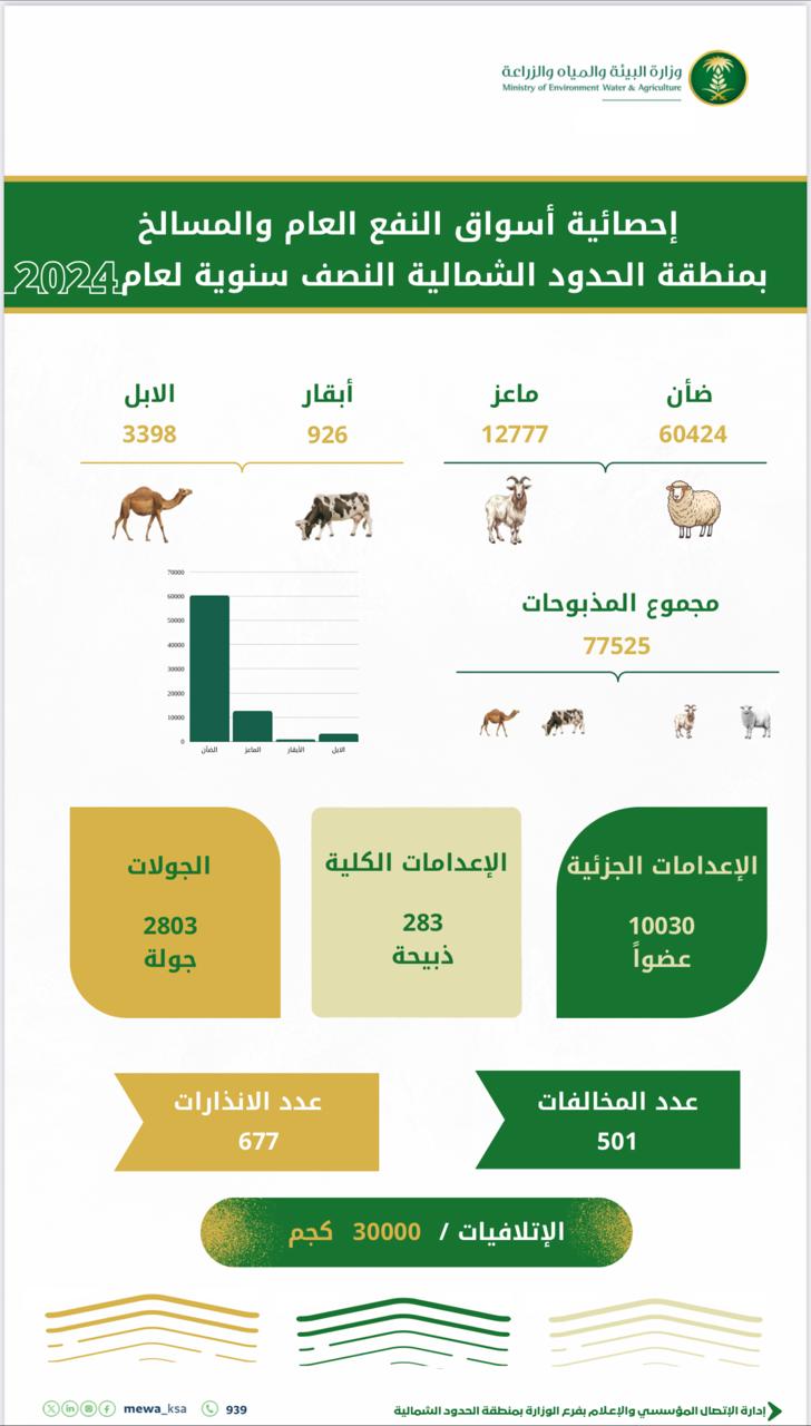 نفّذ فرع وزارة البيئة والمياه والزراعة بمنطقة الحدود الشمالية 2803 جولات رقابية، للمسالخ وأسواق النفع العام خلال النصف الأول من عام 2024م؛ بهدف التأكد من التزام جميع الأسواق والمسالخ بالمنطقة للاشتراطات الصحية والفنية، بما يضمن جودة الخدمات المقدمة للمستفيدين.