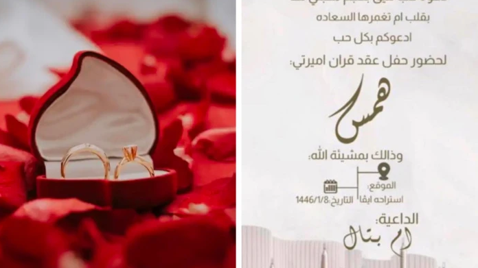 وكانت الدعوة تحتوي على كلمات مؤثرة كلها حب، حيث تقول كلمات الدعوة “دعوة حب تليق بحجم محبتي لك.. بقلب أم تغمرها السعادة أدعوكم بكل حب لحضور حفل عقد قران أميرتي: همس.. وذلك بمشيئة الله تعالى غدًا الأحد الموافق 8|1|1446 باستراحة ايفاء.. الداعية| أم بتال أماني زاهي المزودي”.