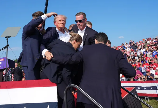 شهد تجمع انتخابي للرئيس الأمريكي السابق دونالد ترامب، في بنسلفانيا إطلاق أعيرة نارية، وأظهرت لقطات مصورة إطلاق النار واختباء ترامب وراء المنصة.