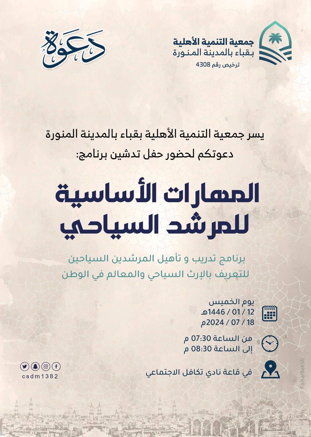 أعلنت جمعية التنمية الأهلية بقباء بالمدينة المنورة عبر موقعها الرسمي بمنصة إكس عزمها تدشين برنامج المهارات الأساسية للمرشد السياحي غداً الخميس الموافق ١٤٤٦/١/١٢هـ الساعة السابعة والنصف مساءً في قاعة نادي تكافل بالمدينة المنورة ، وأوضح رئيس جمعية التنمية الأهليه بقاء بالمدينة المنورة الاستاذ مصلح الصبحي ان هذا البرنامج يهدف لتدريب وتاهيل المرشدين السياحيين للتعريف بالإرث السياحي والمعالم في الوطن