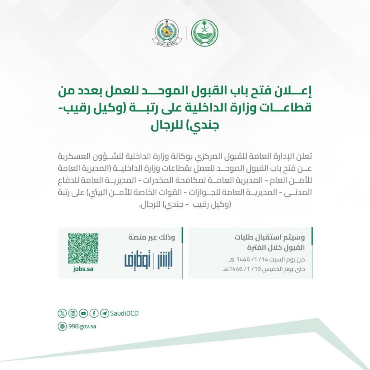 فتح باب القبول الموحد للعمل بعددٍ من قطاعات وزارة الداخلية على رتبة (وكيل رقيب – جندي) للرجال