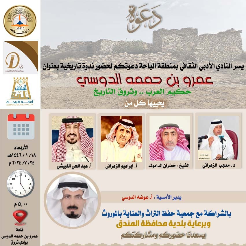 بحضور محافظ محافظة المندق، أ. قاسم بن سعيد القرني، وبرعاية بلدية محافظة المندق ، يقيم نادي الباحة الأدبي الثقافي بالشراكة مع جمعية حفظ التراث والعناية بالموروث، ندوة بعنوان: (عمرو بن حممة الدوسي حكيم العرب – وثروق التاريخ).