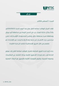 وتابع :” تتجه الفرق المختصة بالمركز إلى موقع الحادثة للبدء في إجراءات التحقيق اللازمة، وذلك للكشف عن الملابسات ومعرفة المسببات والرفع بالتوصيات اللازمة بالتنسيق مع الجهات المعنية “.