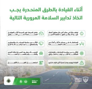 أوضحت الإدارة العامة للمرور، مجموعة من تدابير السلامة المرورية التي يجب اتخاذها من قبل قائدي المركبات أثناء القيادة على الطرق المنحدرة؛ وذلك تزامناً مع التقلبات الجوية التي يشهدها عدد من مناطق المملكة.