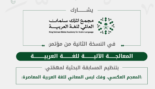 يشارك مجمع الملك سلمان العالمي للغة العربية في النسخة الثانية من مؤتمر: المعالجة الآلية للغة العربية (ArabicNLP 2024)، والمصاحب للمؤتمر السنوي الثاني والستين لجمعية اللغويات الحاسوبية (ACL 2024)، المقرر عقده في مملكة تايلند بالعاصمة بانكوك، في المدة من 11 إلى 16 أغسطس الجاري. وتهدف مشاركة المجمع إلى تعريف الباحثين بمجال المعالجة الآلية للغة العربية بالمجمع، وجذب اهتمام المختصّين إلى فعالياته، وتسويق مخرجاته التقنية المختصّة بالذكاء الاصطناعي والحوسبة اللغوية؛ وفقًا لمستهدفات برنامج تنمية القدرات البشرية (أحد برامج تحقيق رؤية السعودية 2030).