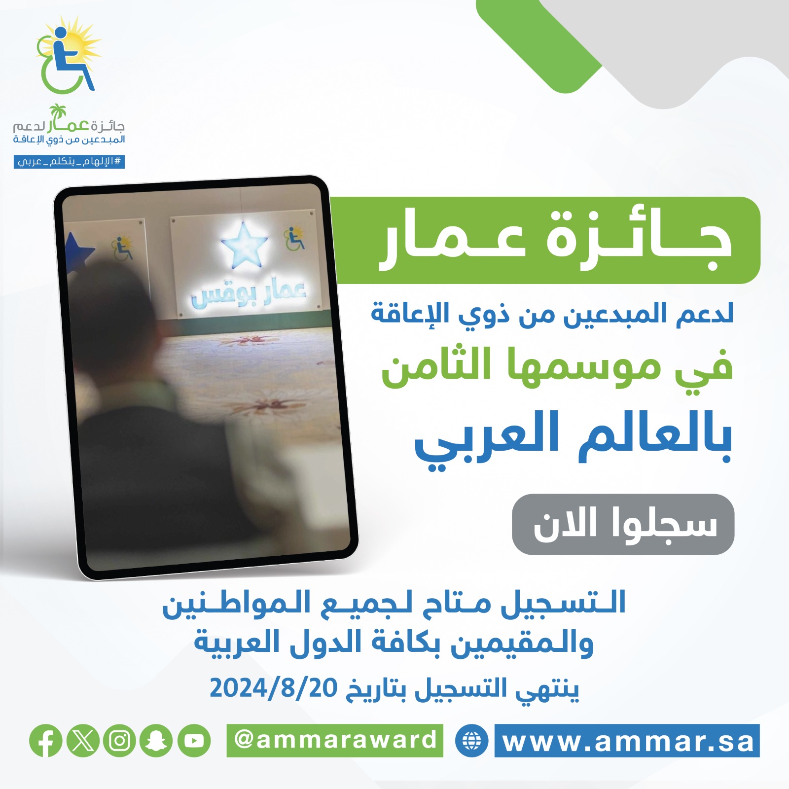 تمديد التسجيل في جائزة عمار لدعم المبدعين من ذوي الإعاقة الموسم الثامن